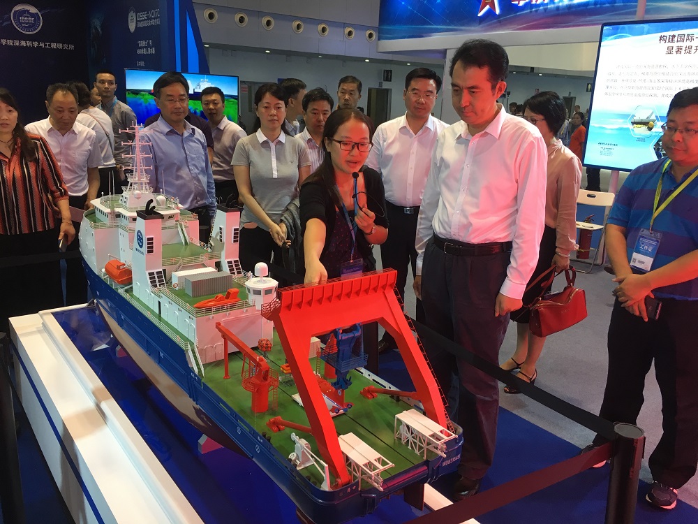 為深入貫徹軍民融合發(fā)展戰(zhàn)略,促進(jìn)軍民融合產(chǎn)業(yè)創(chuàng)新發(fā)展,中國(guó)科學(xué)院深海科學(xué)與工程研究所應(yīng)科學(xué)技術(shù)部的邀請(qǐng),參加此次展會(huì)。深海所展出了“探索一號(hào)”科考船及其搭載的深海儀器設(shè)備模型,以視頻形式向大眾展示了中科院深淵科考隊(duì)“探索一號(hào)”到馬里亞納海溝挑戰(zhàn)者深淵開(kāi)展深淵科考的情況。并利用虛擬現(xiàn)實(shí)技術(shù)(VR)多維解析了我國(guó)擁有自主知識(shí)產(chǎn)權(quán)的載人潛水器“深海勇士”號(hào)的結(jié)構(gòu)原理,通過(guò)VR場(chǎng)景模擬讓觀眾親身體驗(yàn)乘坐“深海勇士”號(hào)潛入深海進(jìn)行科考作業(yè)的場(chǎng)景。