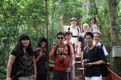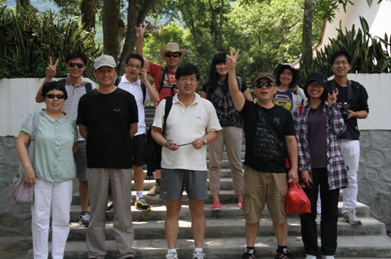 5月11日上午8時許出發,經過兩小時二十分的車程,登山隊伍順利抵達了五指山下。在真正看到素有海南島象征的五指山后,大家都被眼前的美景所陶醉,放眼望去,群山環繞,云海茫茫。在觀山臺正面眺望五指山,五峰并列如擎天五指,在云海中時隱時現,盡收眼底。隨著一聲令下,大家迅速收拾起陶醉的心情,開始向頂峰攀登。景區內古樹參天,巨石嵯峨,藤蘿密布,奇花異草隨處可見,大家一邊登山,一邊欣賞著美景,心情格外的舒暢歡愉。途中歡聲笑語不時響起,團隊氣氛輕松融洽,在一些陡峭難行的路段,大家相互幫助,你托我扶,處處體現著同事間的關愛和團隊協作精神。隨著時間的推移,腳力好的隊員沖鋒在前,已尋不到蹤影。午后一點,天空逐漸陰了下來,不時有點點雨星落下,看著遠遠的山峰,腳下盤根錯節,蜿蜒陡峭的山路,為了安全起見,大家決定簡單休整后下山。當聚在半山腰,圍坐在一起,盡情領略著熱帶原始森林的秀美,享受著精美的午餐時,大家忘卻了登山的勞頓,說說笑笑,儼然成了這美景中的一部分。沖在前面的兩名隊員遲遲未能回歸,經過一番聯系,電話那頭傳來興奮、驚喜地聲音,原來他們已經登上了最高峰……下午四時許,12名隊員在回程的路上熱鬧的交流著登山的感受,兩名登到頂峰的隊員,更是激動興奮地給大家講頂峰奇特瑰麗的風景,聽得大家仿佛置身其中一斑。