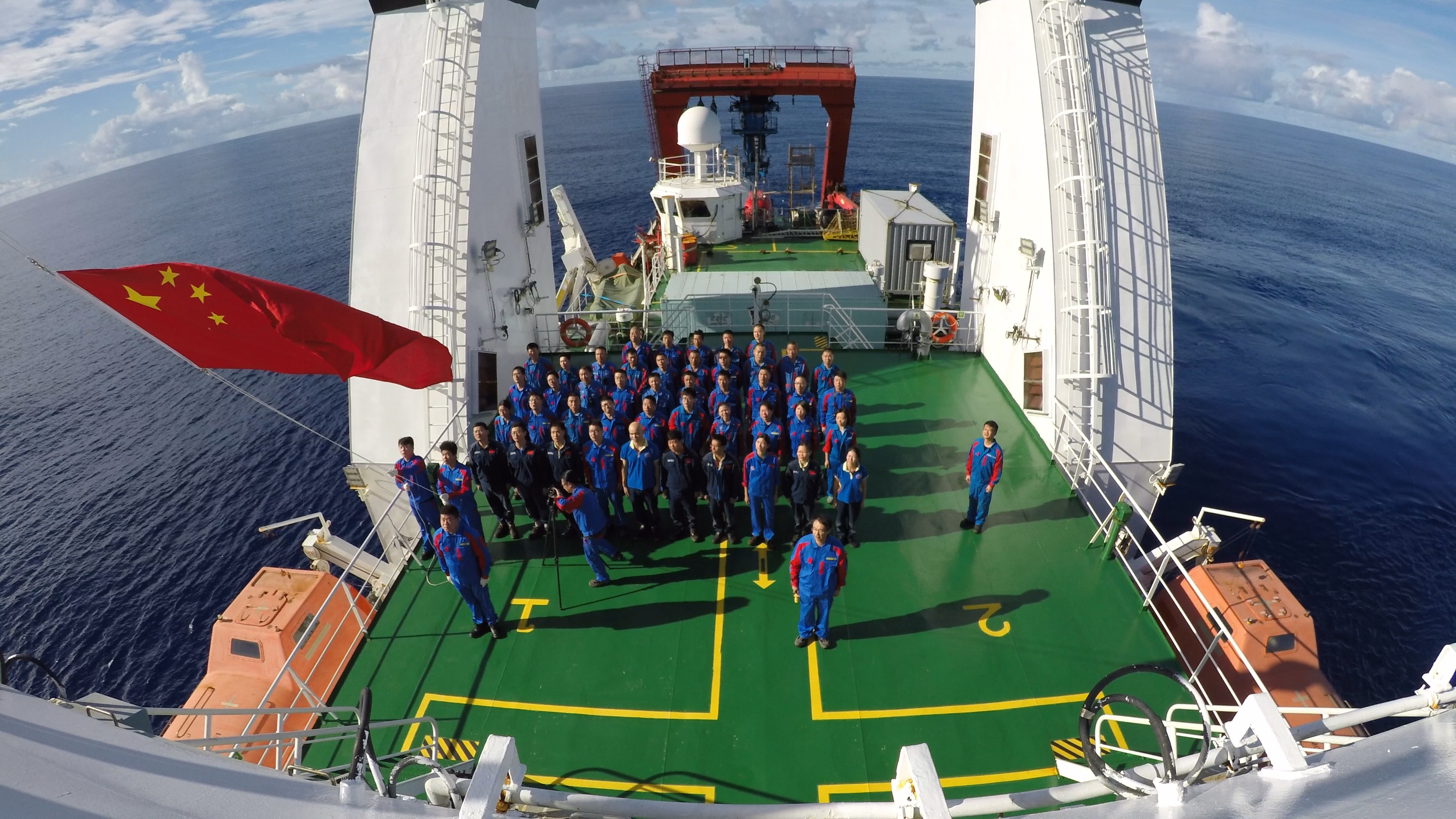 10月1日上午725分,中科院TS14深潛航次全體科考隊員在遠離祖國大陸1700多海里的大洋上舉行隆重的升國旗儀式,熱烈慶祝中華人民共和國成立70周年。