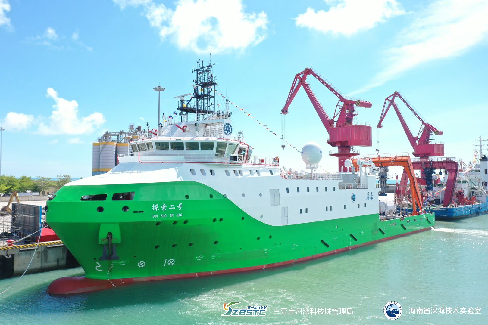 625, “探索二號”船從福建馬尾造船廠碼頭啟航,經過830海里的航程, 28日下午,順利抵達三亞崖州灣科技城南山港碼頭。來自海南省人民政府、海南省科學技術廳、深圳市規劃和自然資源局、中國船舶集團702研究所、704研究所、武漢理工大學、中科院沈陽自動化所、中科院聲學研究所、三亞崖州灣科技城管理局等相關單位代表共200余人參加接船儀式。