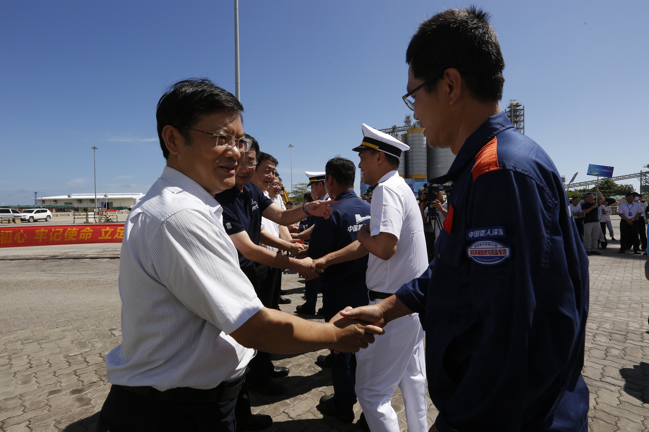 當天下午,驕陽似火,“探索二號”船搭載著60名參加首航的科考隊員順利返航,遠遠看去,船舶右舷橫掛著兩條巨型橫幅——“砥礪探索 不懈奮斗 勠力開創中國深??萍夹抡鞒獭保弧叭齺?,你好,我回家了!”,橫幅內容振奮人心、充滿溫情,首次亮相的“探索二號”船緩緩駛入南山港碼頭,下午3點整,準時???,參航人員依次從甲板下船,和接船來賓一一握手擁抱,場面感人。