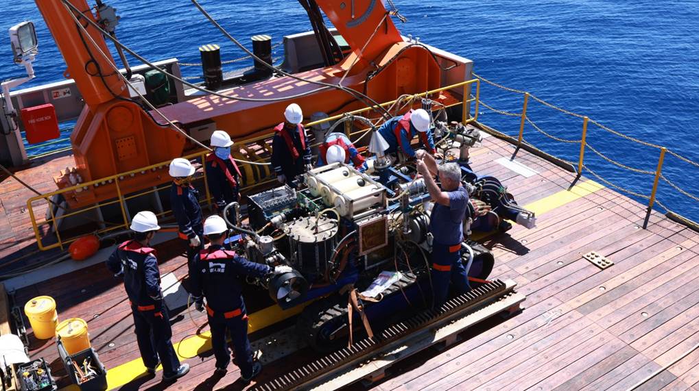 本航次中,由招商工業(yè)-深海所聯(lián)合實(shí)驗(yàn)室共同研發(fā)的富鈷結(jié)殼采礦車完成了海底行走、切削破碎、樣品采集等獨(dú)立作業(yè)任務(wù)。此外,通過與“深海勇士”號載人潛水器聯(lián)合作業(yè),實(shí)現(xiàn)采礦試驗(yàn)區(qū)連續(xù)原位實(shí)時監(jiān)測和取樣,并對試驗(yàn)前、試驗(yàn)后的環(huán)境分別采樣調(diào)查。