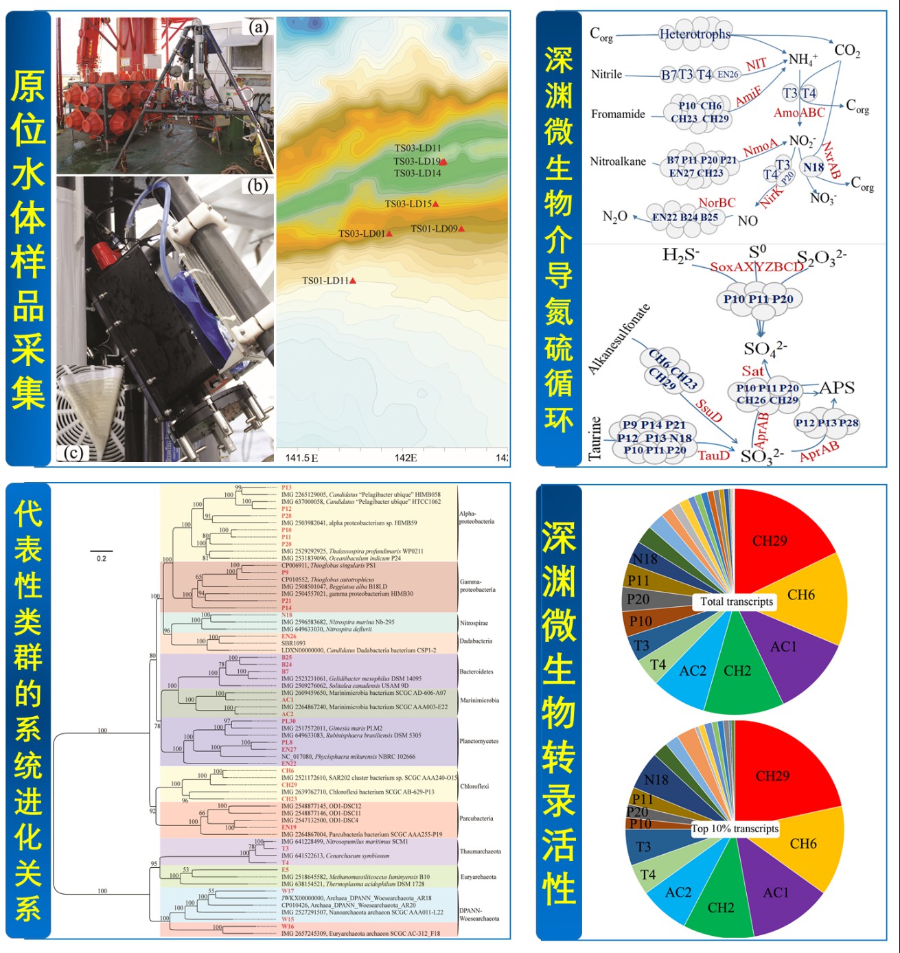 ISMIFF首先在中國科學院深海科學與工程研究所所執行的馬里亞納深淵科考航次中進行了實驗性應用??茖W家們采集了挑戰者深淵序列深度的水體微生物原位樣品,通過宏基因組測序對深淵原位條件下的水體微生物群落組成進行了解析,結果表明原位條件下的微生物群落組成與常規Niskin采水瓶采集的樣品有很大差異(Wang et al. 2019)。基于新的基因組分揀技術,研究人員成功獲取了30個深淵微生物類群的高質量基因組序列,闡明了與氮硫相關的元素循環過程和轉錄活性特征,并重點闡釋了Chloroflexi和Marinimicrobia分別在深淵難降解型有機物和蛋白類有機物的代謝方面所發揮的重要作用(圖2;Gao et al. 2019)。該研究是中國科學家首次對深淵微生物基因組進行較為全面的解析對其原位代謝活性進行了詳盡的報道,揭示深淵特殊極端環境對微生物種群分化的驅動作用。另外,此研究還表明深淵特定微生物類群可能通過氧化CO來獲取能量,拓展了CO氧化菌的已知生存空間范圍(Gao et al. 2019)。